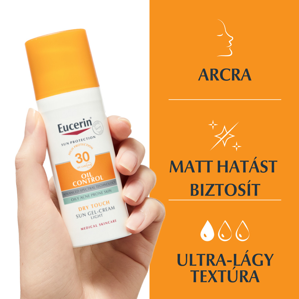 Az Eucerin® Sun Oil Control napozó krém-gél arcra FF30 mindennapos használatra szánt, magas fényvédő faktorú napozó termék, melyet kifejezetten zsíros és aknéra hajlamos arcbőrre fejlesztettek ki. Amellett, hogy magas szintű fényvédelmével megóv a napsugárzás bőrkárosító hatásai ellen, aktív hatóanyagaival javítja a bőr állapotát is.